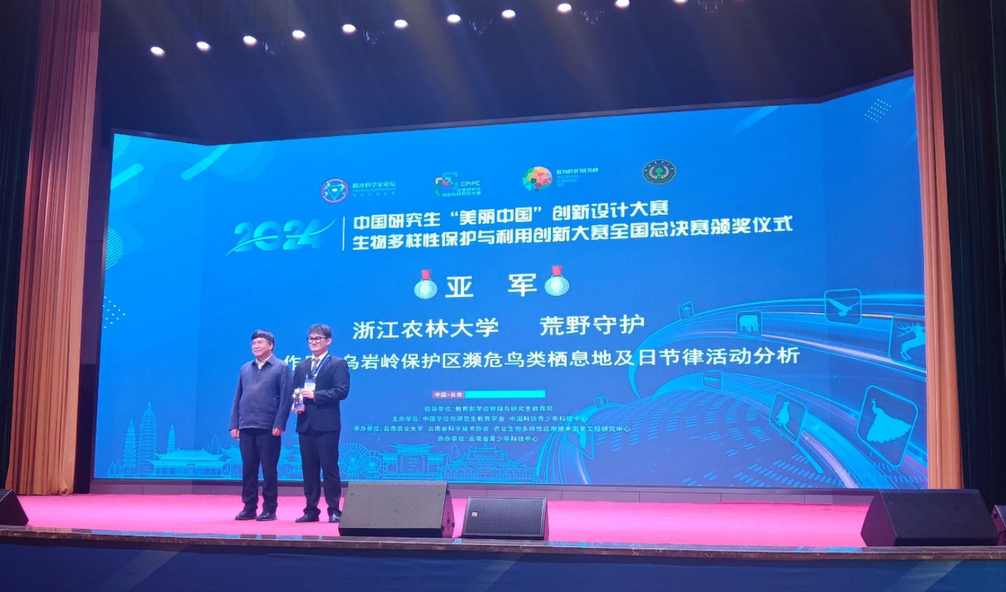 12月6日—7日,中國研究生“美麗中國”創新設計大賽——生物多樣性保護與利用創新大賽全國總決賽在云南昆明舉行。經過多輪專家評審、總決賽現場答辯等環節,由動科動醫學院選送的《烏巖嶺保護區瀕危鳥類棲息地及日節律活動分析》項目,從84家培養單位的328件作品中脫穎而出,獲得亞軍和一等獎,指導老師何珂和王芷筠榮獲“優秀指導老師”榮譽稱號。