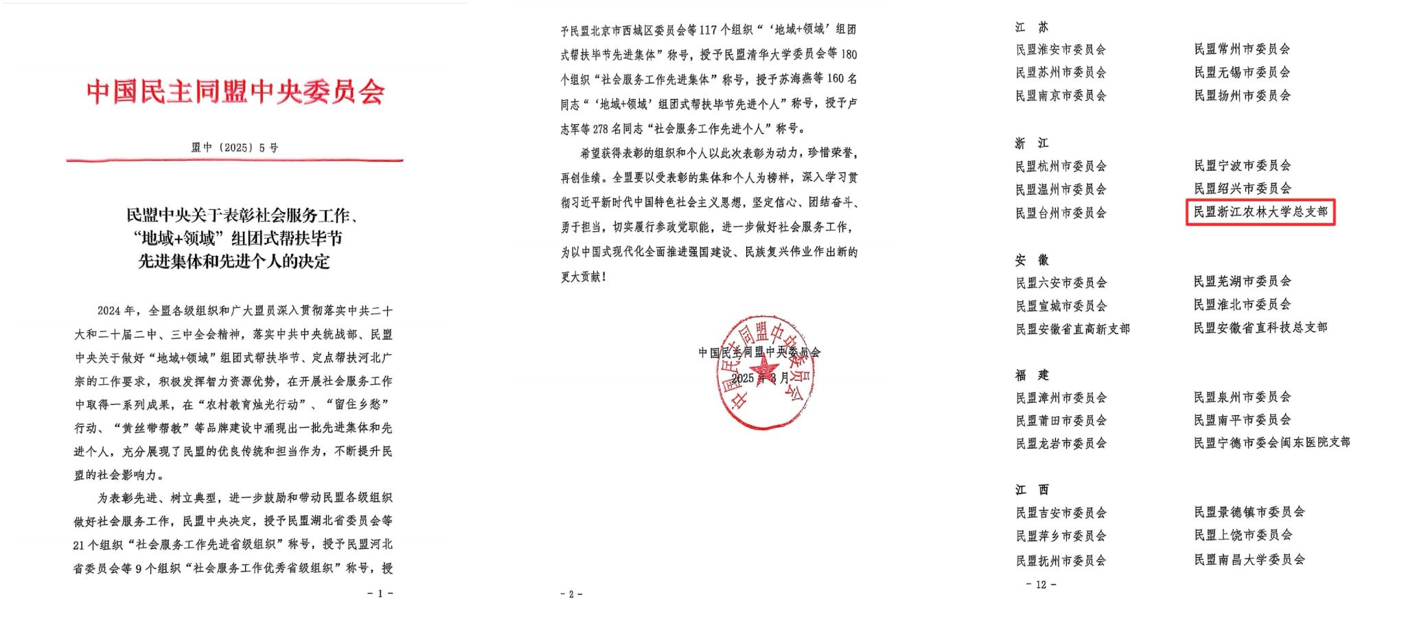民盟浙江農(nóng)林大學(xué)總支榮獲民盟中央“社會(huì)服務(wù)工作先進(jìn)集體”稱號(hào)