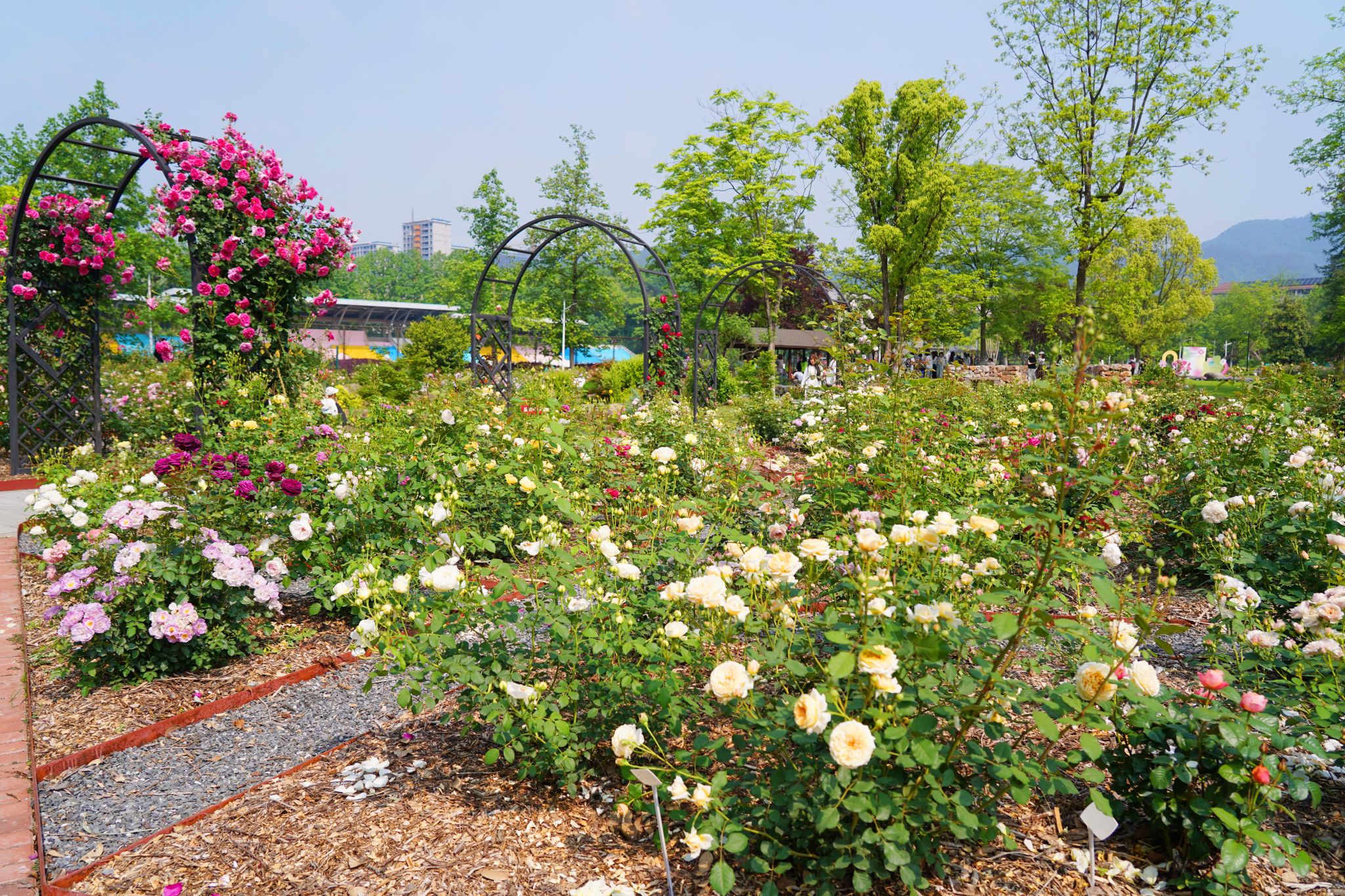 上百個品種的月季攀滿歐式廊架