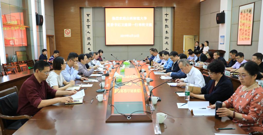 4月24日下午,山西師范大學黨委書記衛建國、黨委副書記郝勇東、紀委書記劉奎生一行24人來我校考察調研。校黨委副書記馮尚申,校黨委委員、組織部部長童曉暉陪同調研。