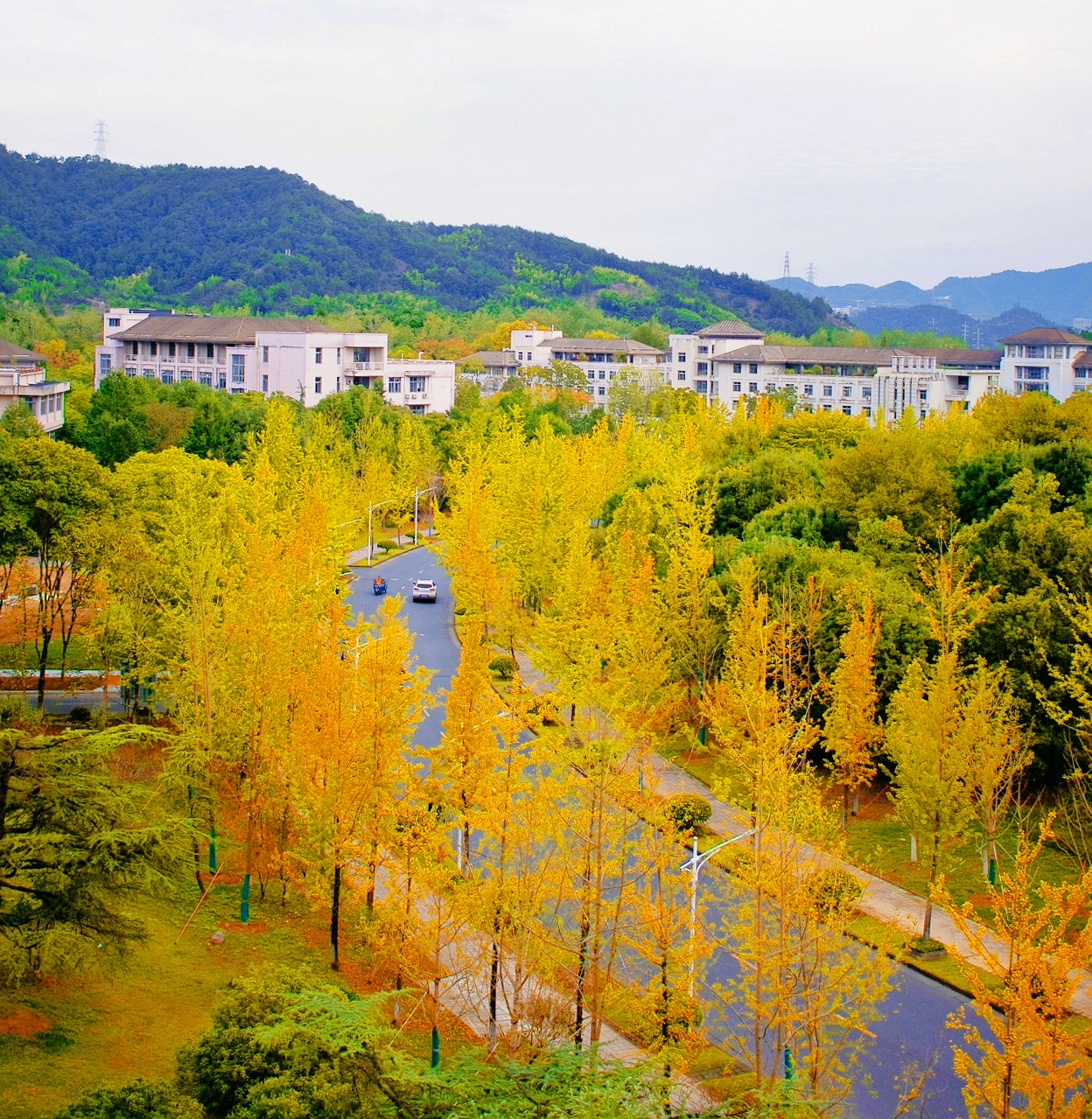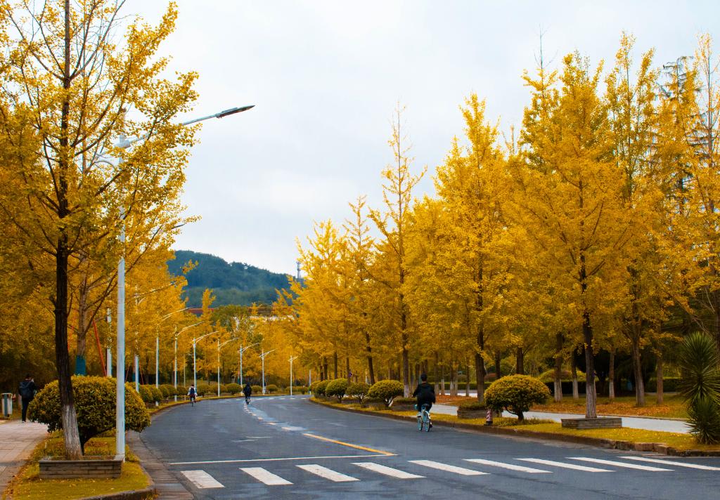 暖陽下,秋色一點點在林稍間抹開。沐浴著秋日陽光,坐在黃透的銀杏樹下,一幅幅醉美秋意畫卷正在浙農林大校園徐徐展開,葉片和枝椏的縫隙間,是光與影的完美融合,是色與彩的交織碰撞。教學樓門外的楓樹也擎起了火炬,層林盡染,漫山紅遍,那火熱的色彩點燃了生命,也點燃了秋天。松柏翠綠依舊,沉穩地微笑著,注視著這并不缺少色彩的秋。
