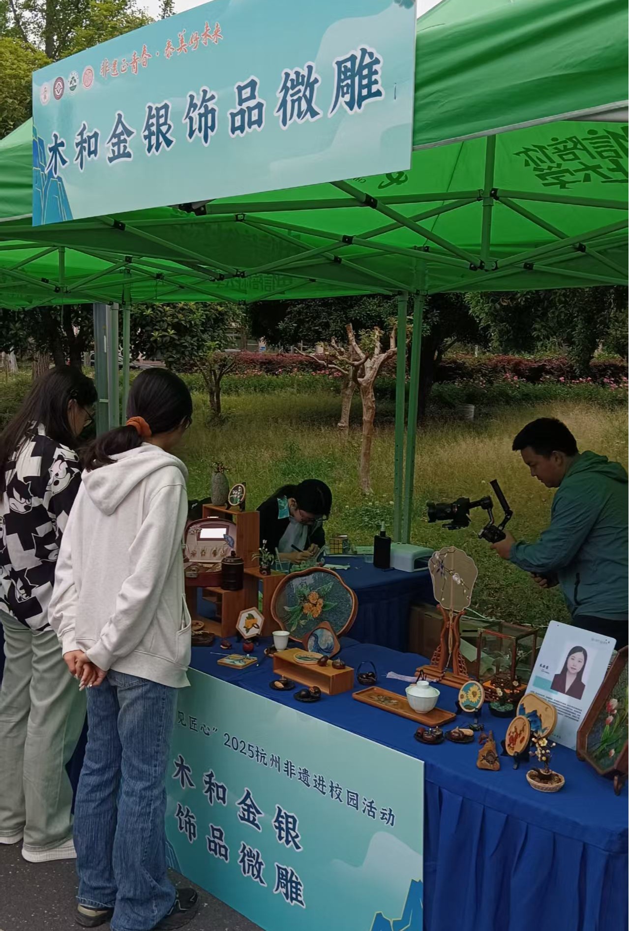 活動現(xiàn)場,設(shè)有杭州小熱昏、泥人、剪紙、面塑、糖塑、五柳雅扇、武林盤扣、微型木雕、藍(lán)印花布印染技藝、古法艾灸等15個(gè)非遺項(xiàng)目和傳統(tǒng)舞蹈、中國茶藝、疊石技術(shù)、插花藝術(shù)4個(gè)學(xué)生藝展。各展位的非遺傳承人及作品齊聚,大家各展其能,小熱昏的鑼聲、艾草的香味、濃郁的紅茶、精美的盤扣等,好看、好玩、好聞、好聽,吸引了近千名師生駐足體驗(yàn),進(jìn)一步激發(fā)了大學(xué)生群體對非物質(zhì)文化遺產(chǎn)的濃厚興趣。