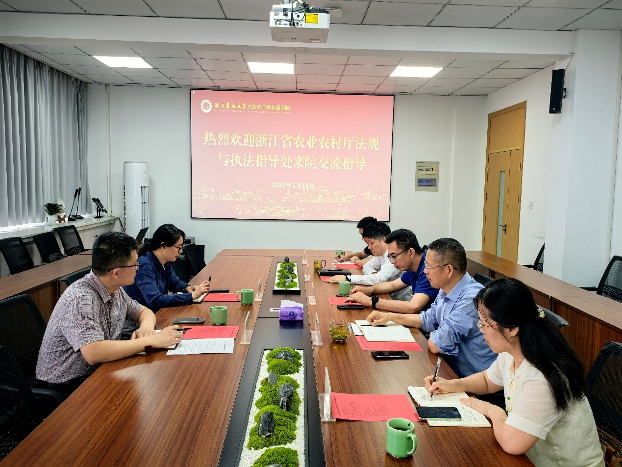 5月16日,浙江省農業農村廳法規與執法指導處處長張樹旗、副處長鄔赟燕到文法學院交流工作。黨委組織部部長董杜斌、文法學院院長魯可榮、法學學科負責人賈愛玲等參與交流。交流會由文法學院黨委副書記(主持工作)徐達主持。