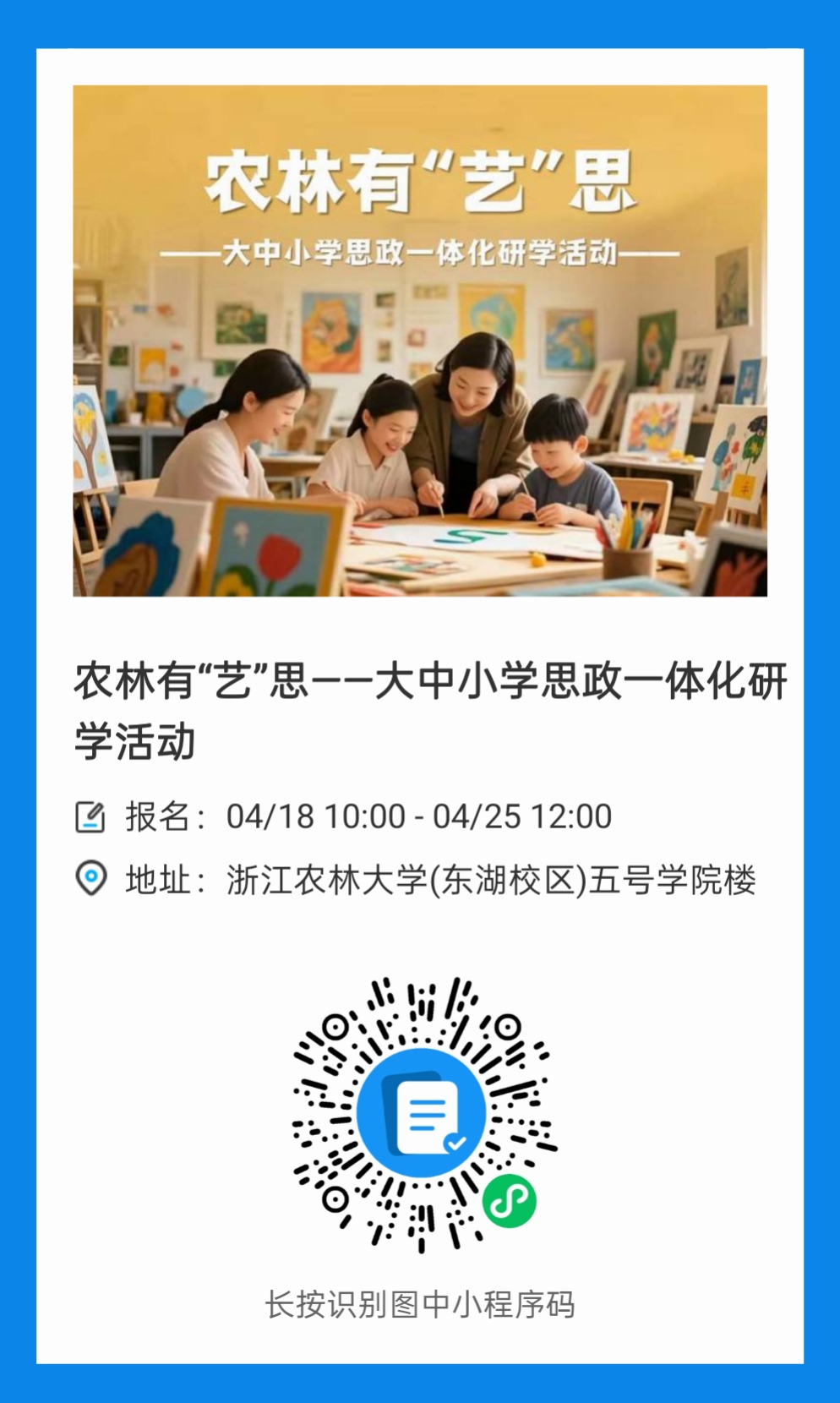 為深入推進機關黨委“幸福·溫暖·健康”教職工文化建設,增強廣大教職工的歸屬感、獲得感、幸福感,并利用專業優勢搭建各學段思政教育的橋梁紐帶,打造“一盤棋”的思政育人陣地,構建“一體化”思政育人格局。結合工作實際,學校辦公室、機關黨委、藝術設計學院擬開展農林有“藝”思——大中小學思政一體化研學活動。現將具體安排通知如下: