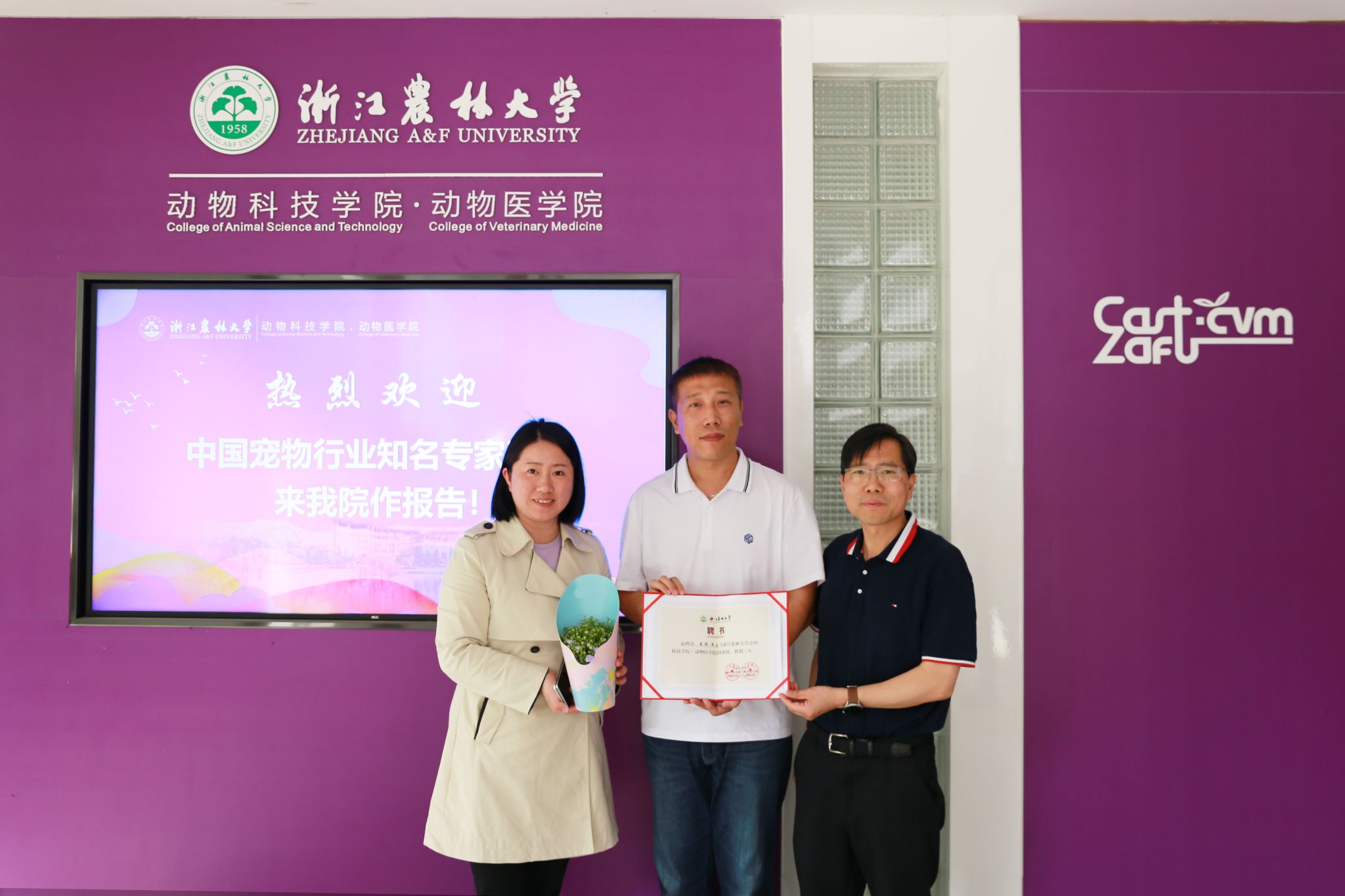 會前,宋厚輝、魏玲玲與王爍座談交流,動物健康檢測中心相關負責人陪同,就現代寵物商學院的運行、小動物福利分會年會、畢業生晚會相關事宜研討交流。宋厚輝為王爍頒發客座教授聘書。