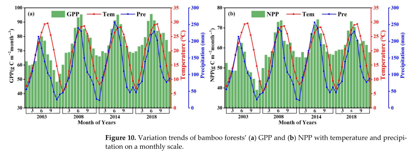 竹林是我國亞熱帶地區重要且特殊的森林資源,由于其分布范圍廣、生長速度快、固碳能力強等特點,在調節全球碳平衡等方面發揮著重要的作用。本研究以中國竹林為研究對象,以中國竹林遙感分布信息、竹林LAI同化數據產品和土壤、氣象等數據等驅動BEPS模型,模擬2001-2018年近20年中國竹林GPP和NPP,并分析了GPP、NPP時空演變格局及其對氣候因子的響應。