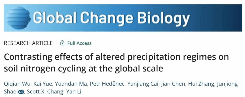 近日,國家重點實驗室森林生態學研究團隊(李彥教授團隊)再次以長文形式(Research Article)在國際知名期刊《Global Change Biology》(中科院1區,IF = 13.211)發表原創研究成果。該研究以“Contrasting effects of altered precipitation regimes on soil nitrogen cycling at the global scale”為題,系統闡述了全球范圍內干旱區和濕潤區土壤氮循環過程(輸入、固存和輸出)對降水改變的不均衡響應。