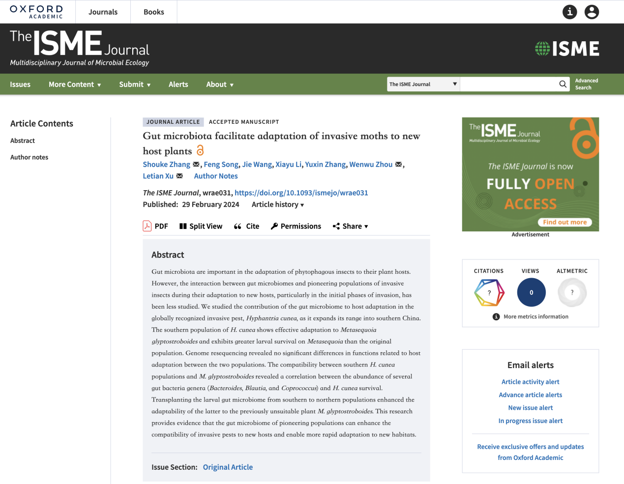 近日,林生院森林保護(hù)學(xué)科青年教師張守科在國(guó)際知名學(xué)術(shù)期刊《The ISME Journal》(中科院1區(qū),TOP,IF5 = 12.3)在線發(fā)表了題為“Gut microbiota facilitate adaptation of invasive moths to new host plants”的研究論文。