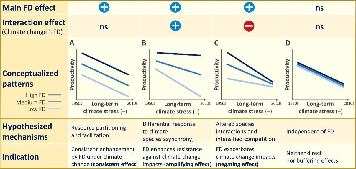 基于此,陳信力教授與多位國際學者合作,通過分析2491個森林樣地超過57年的數據,探討了樹木功能多樣性和功能性狀對森林生產力在面對環境變化時的影響。研究發現,盡管干旱地區森林生產力因水分下降的壓力而普遍下降,具有較高功能多樣性的森林卻能維持相對較高的生產力水平,而功能多樣性較低的森林生產力下降更顯著。此外,具有資源獲取型特征的森林可以從氣候變暖中受益,而具有耐旱特征的森林對干旱表現出更好的抵抗能力。該研究表明,促進森林的功能多樣性可以增強其對氣候變化的適應能力和韌性。通過了解樹木物種的功能性狀,森林管理策略可以優先選擇能夠耐受或從變化的環境條件中受益的物種,這對于促進森林生態系統應付氣候變化的長期可持續性至關重要。