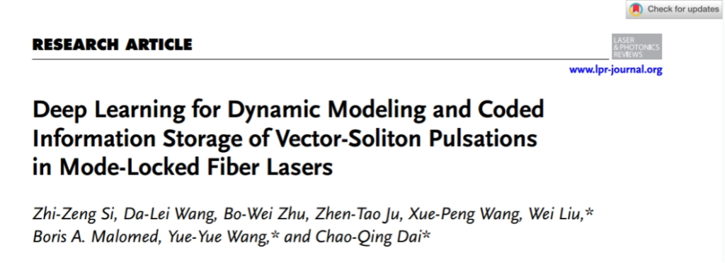 近日,光機電學院先進光電子應用基礎交叉研究中心戴朝卿教授團隊以《深度學習用于模式鎖定光纖激光器中矢量-孤子脈沖的動態建模和編碼信息存儲)》(Deep learning for dynamic modeling and coded information storage of vector-soliton pulsations in mode-locked fiber lasers)為題在線發表在光學領域國際權威期刊《Laser & Photonics Reviews》(激光與光子學評論)上(中科院1區,IF5:11.1)。該項工作將神經網絡方法首次應用于光學孤子非平穩動力學領域,實現了光纖激光器復雜孤子演化的精準預測并應用于高容錯信息編碼。該論文成果的第一單位為浙江農林大學光機電工程學院,第一作者為碩士研究生司志增,論文共同第一作者為王大磊副教授,論文通訊作者為光機電工程學院戴朝卿教授,共同通訊作者為劉威副教授、王悅悅教授。
