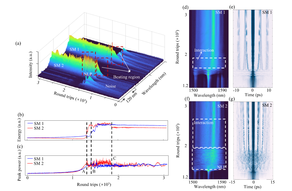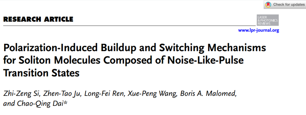 近日,光機(jī)電工程學(xué)院戴朝卿教授領(lǐng)銜的先進(jìn)光電子應(yīng)用基礎(chǔ)交叉研究中心科研團(tuán)隊(duì)在光學(xué)領(lǐng)域國(guó)際權(quán)威期刊《Laser & Photonics Reviews》(中科院1區(qū)TOP,五年影響因子:11.1)上發(fā)表了題為《極化誘導(dǎo)的涉及類噪聲過渡態(tài)的孤子分子累積與切換機(jī)制》(Polarization-Induced Buildup and Switching Mechanisms for Soliton Molecules Composed of Noise-Like-Pulse Transition States) 的研究論文。這是該研究團(tuán)隊(duì)近兩個(gè)月內(nèi)第二次在該期刊發(fā)表高水平文章,首次在高強(qiáng)度光場(chǎng)中揭示了孤子抵抗強(qiáng)非線性效應(yīng)而發(fā)生的新型建立與切換機(jī)制,這不僅在理論上豐富了非線性光學(xué)和孤子動(dòng)力學(xué)的研究?jī)?nèi)容,還在實(shí)際應(yīng)用中展示了其潛在的巨大價(jià)值,為光學(xué)信息處理技術(shù)的發(fā)展開辟了新的方向。