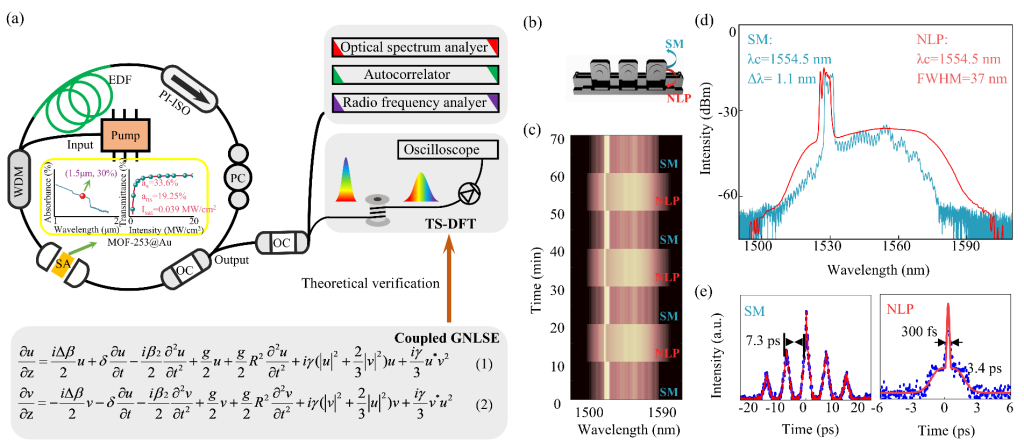 在現(xiàn)代光學(xué)和非線性光學(xué)領(lǐng)域,非線性孤子動(dòng)力學(xué)的研究具有重要的理論和應(yīng)用價(jià)值。特別是在高強(qiáng)度光場(chǎng)下,光學(xué)系統(tǒng)中的噪聲和強(qiáng)非線性效應(yīng)導(dǎo)致孤子行為的不可預(yù)測(cè)性,探索一種能夠在強(qiáng)非線性環(huán)境中穩(wěn)定存在的孤子構(gòu)建和切換機(jī)制,對(duì)于提升光學(xué)系統(tǒng)的性能具有重要意義。戴朝卿教授團(tuán)隊(duì)針對(duì)強(qiáng)光場(chǎng)環(huán)境下的孤子穩(wěn)定性,設(shè)計(jì)了一種新型的強(qiáng)非線性光學(xué)系統(tǒng),包括飽和吸收體金屬有機(jī)框架(MOF-253@Au)和極化控制器,揭示了孤子分子在復(fù)雜非線性系統(tǒng)中的動(dòng)態(tài)行為。研究發(fā)現(xiàn),強(qiáng)非線性下孤子分子為抵抗光學(xué)腔中的“湍流”,在建立階段會(huì)形成一種長(zhǎng)時(shí)間的類噪聲脈沖過渡態(tài)。通過極化誘導(dǎo),多脈沖態(tài)下由交叉相位調(diào)制效應(yīng)主導(dǎo)的孤子分子與類噪聲脈沖之間的切換機(jī)制也被剖析,主要涉及譜崩潰與振蕩以及噪聲態(tài)到自組織過程。理論上綜合分析了極化角度對(duì)孤子態(tài)周期性相變的影響,并準(zhǔn)確再現(xiàn)了實(shí)驗(yàn)中觀察到的構(gòu)建和切換機(jī)制。