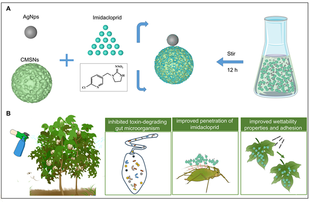 本研究利用具有顯著抑菌活性的AgNps與高效給藥能力的MSNs,構建了二元協同殺蟲劑傳遞系統。該殺蟲劑遞送系統,對具有降解吡蟲啉功能的腸道微生物具有靶向性,通過抑制腸道菌的豐度,提高吡蟲啉的殺蟲效果。另一方面,該殺蟲劑遞送系統的植物葉片潤濕性、粘附性和滲透性,相比化學殺蟲劑吡蟲啉本身顯著提高,從而具有較高的靶向性與持效性。對該殺蟲劑遞送系統的安全性評估發現,其相比化學殺蟲劑吡蟲啉本身,其對天敵昆蟲相對安全,證明其較低的環境風險。該研究豐富了二元協同納米粒子介導的殺蟲劑傳遞系統的發展,有利于抗性害蟲的科學防控。