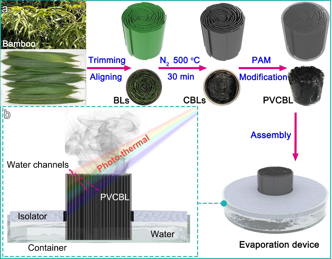 該成果以計算機光路模擬為指導,利用碳化竹葉(CBLs)構造了一種新的光吸收結構。接著利用聚丙烯酰胺(PAM)對該結構進行了修飾,制成集光吸收、光熱轉化和水傳輸三大功能于一體的太陽能界面水蒸發器(PVCBL)。一方面,該蒸發器可利用豎直排列的片狀竹葉衍生碳結構擴展光路,增加吸光面積,因而具有出色的光吸收性能。另一方面,在豎直排列的CBLs之間連續分布的PAM水凝膠可以作為垂直通道,支持水的高速運輸,并且縮短水蒸發路徑。因此,該蒸發器的平均光吸收率達到~96.1%,其在一個太陽(1 KW m-2)光照下的水蒸發速率為1.75 kg m-2h-1,光-汽轉化效率高達91.9%。另外,基于該蒸發器的蒸發設備在完成水蒸發的同時,可同步實現海水淡化、重金屬離子移除、以及染料分離。此外,該設備適用于戶外,并具備重復循環使用的能力。該研究工作為利用生物質材料實現高效太陽能水蒸發和協同水處理提供了一種創新思路。